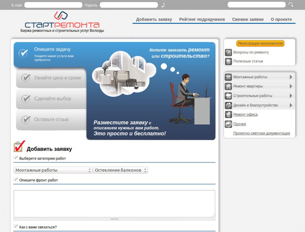 Год назад я запустил интернет-проект startremonta.ru. Портал задумывался как площадка для взаимодействия между компаниями, которые предлагают услуги по ремонту и отделке помещений и заказчиками ремонтных работ.
