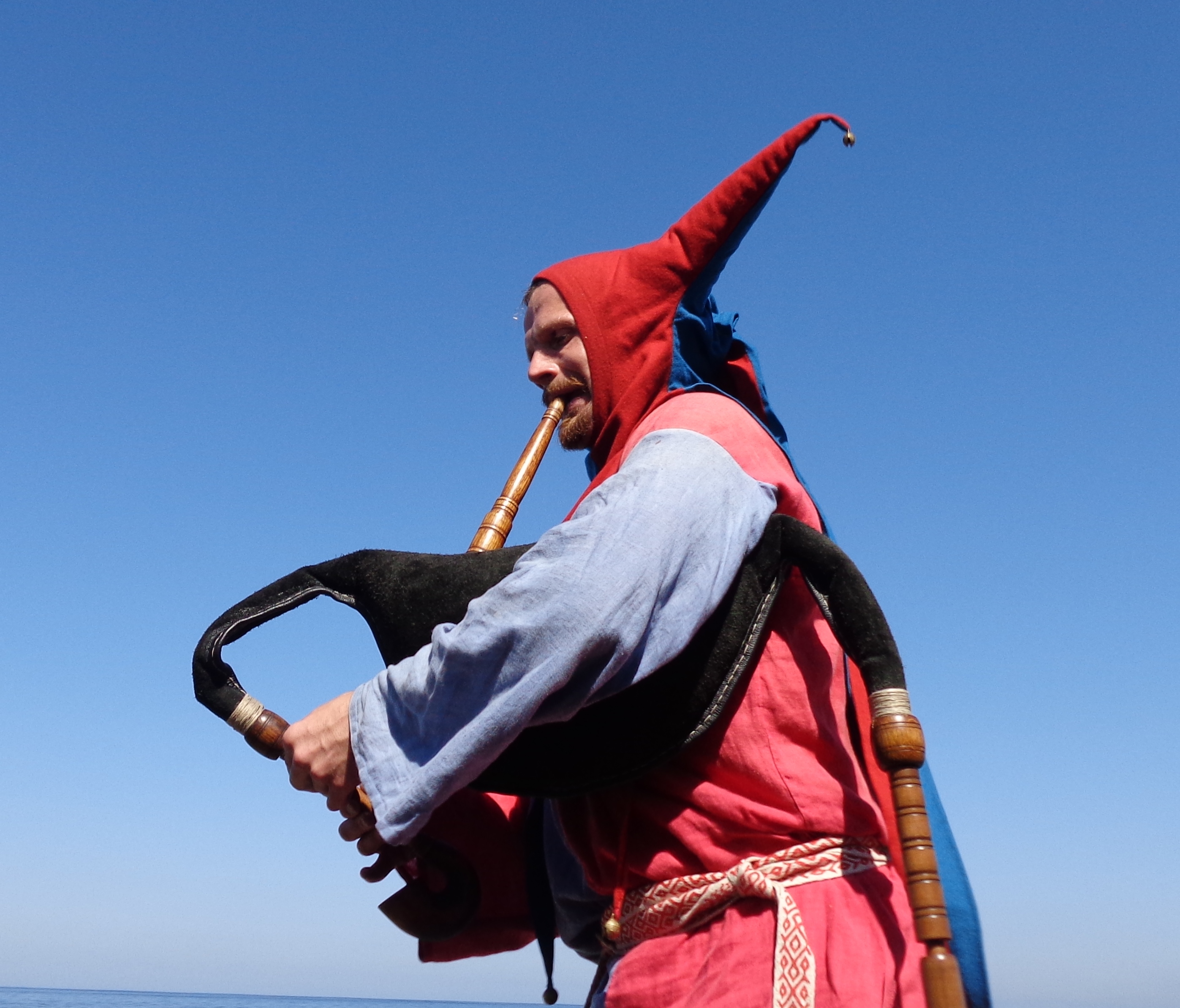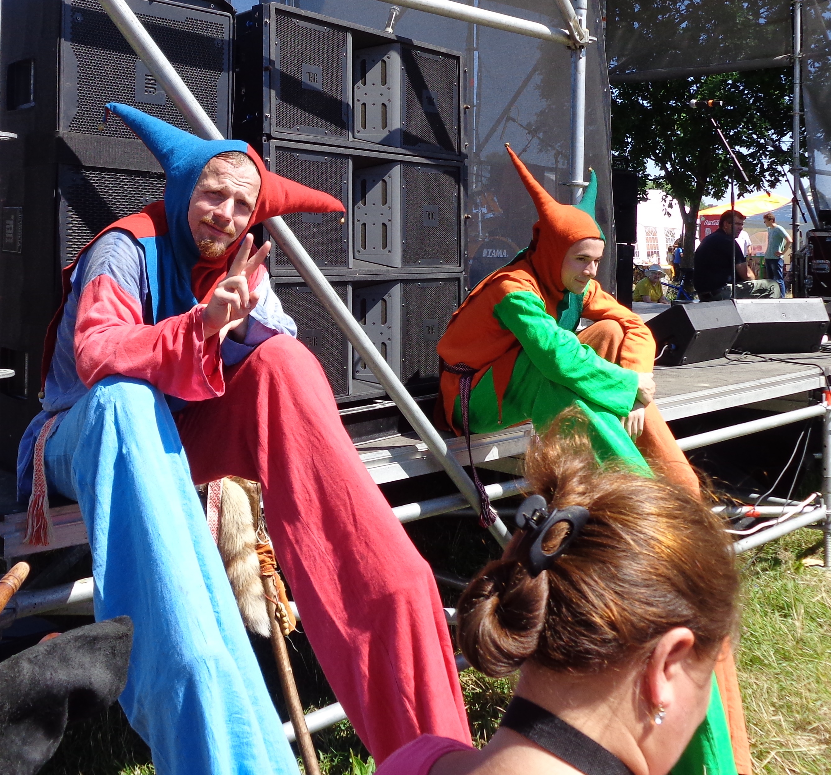 Шут-волынщик — на фоне неба, потому что ходули реально длинные, приходится задирать голову.