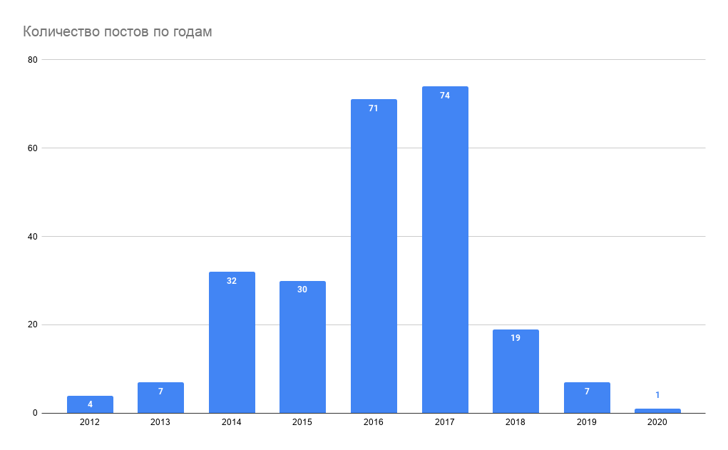 Что любопытно: при такой серьезной мотивации, с практикой не складывалось. Последний настоящий пост (не анонс) в этом блоге был аж в марте 2019. Вот не идет и все (а заставлять себя в таком деле — дурная работа). Заморочился посчитать, сколько статей написал в разные года. Картина получалась вполне ожидаемая: