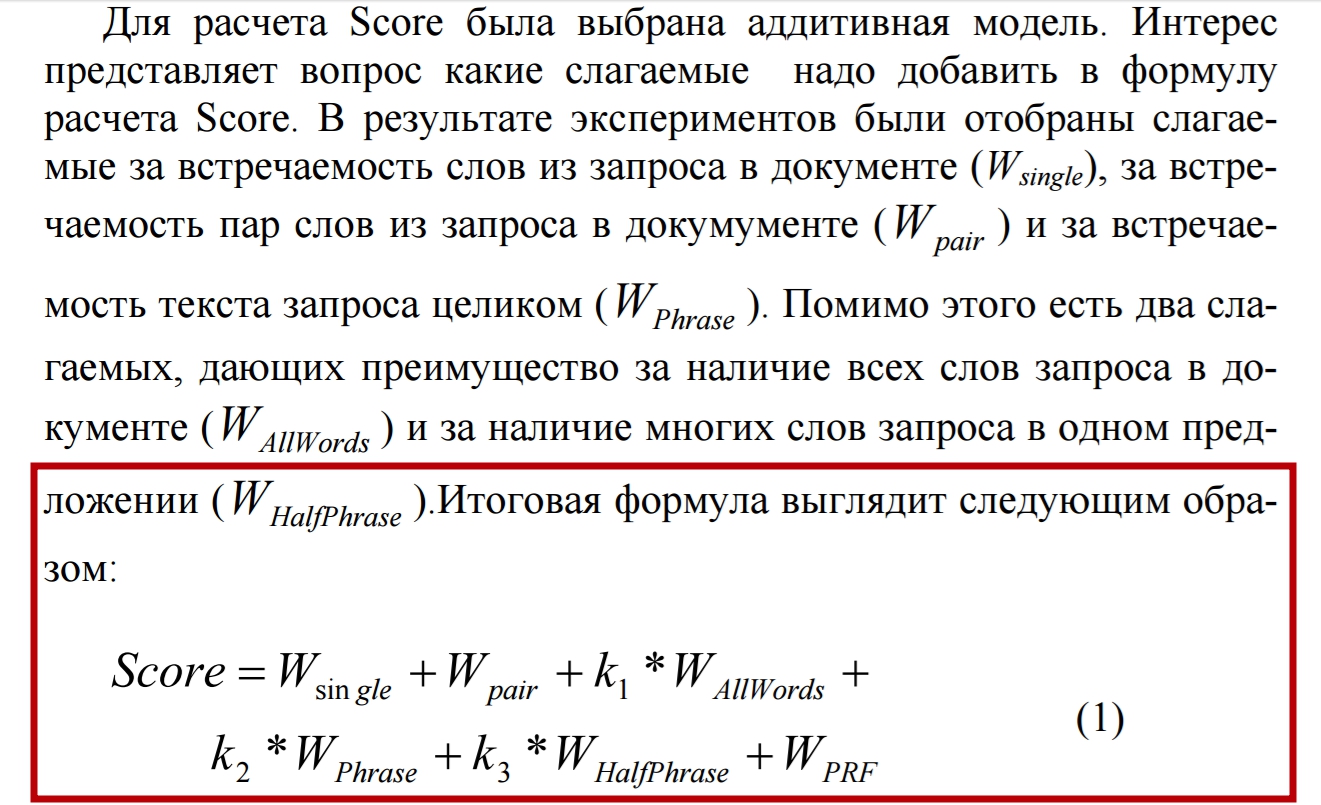 Как видим, формула не такая уж большая и сложная. Всего 5 слагаемых дают оценку текстовой релевантности, которая позволяет неплохо ранжировать документы.