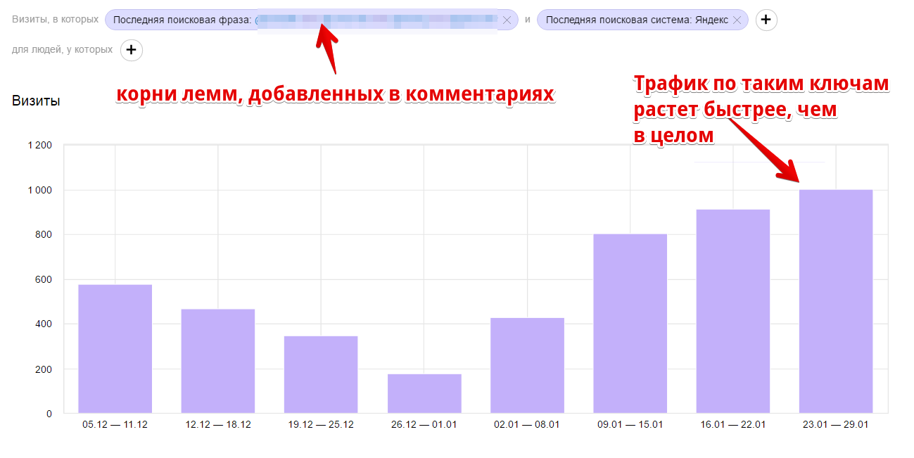 Если конкретнее: в целом трафик с Яндекса вырос на 63%, а трафик, связанный с 7 наиболее важными новыми леммами — на 91%.
