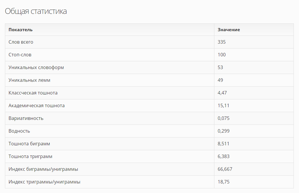 • Дина, эти индексы показывают, насколько часто вы используете определенные устойчивые сочетания (чаще всего это ключевые слова). Одна из типичных проблем «плохих» статей — перенасыщение ключевыми словами. При этом общее число вхождений может быть не очень большим, но ключевики расположены в тексте неестественно (постоянно сбиваются в биграммы и триграммы).