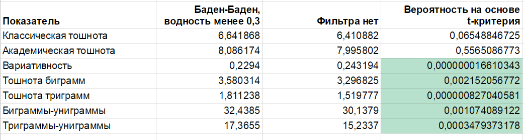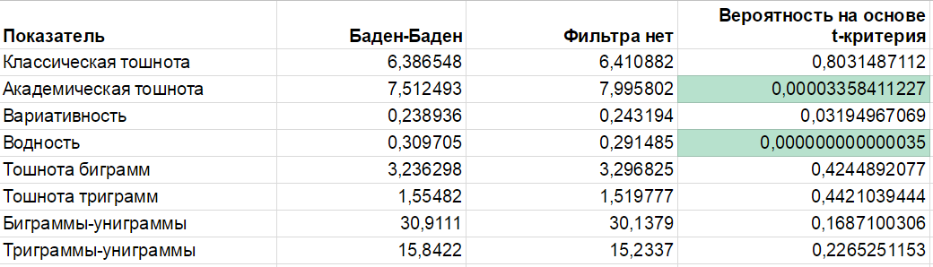 Долго вглядываться в нее не надо, главный вывод — статистически достоверные различия демонстрируют только средние значения по академической тошноте и по водности (вероятность значительно меньше 1%, выделено зеленым). Все остальное принимать во внимание нельзя.