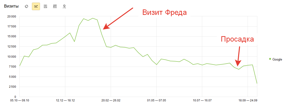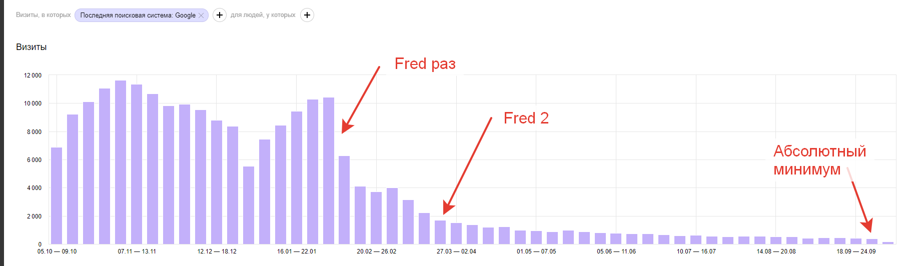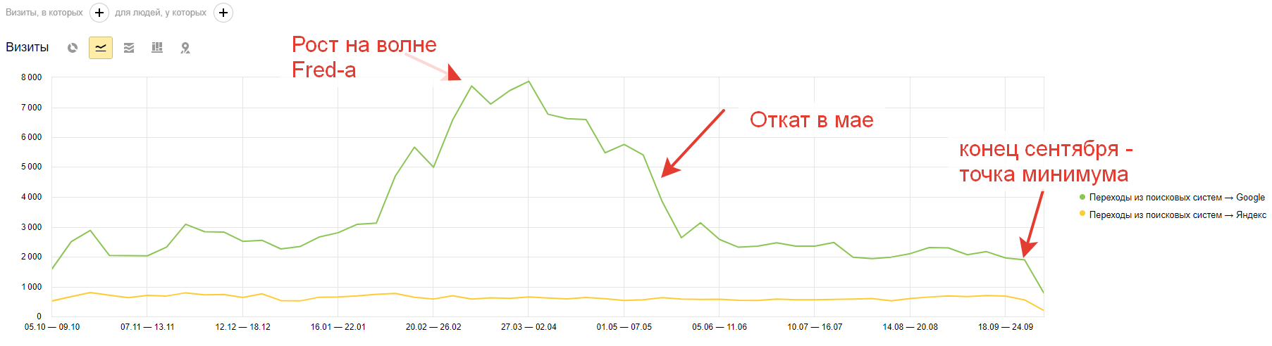 В обсуждениях часто всплывает мнение, что свежие изменения — это продолжение линии Google Fred, то есть апдейтов в марте и феврале этого года. Вообще-то проводить параллели преждевременно. С другой стороны, понять, не поменялись ли подходы Fred-а к ранжированию — весьма полезно.