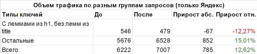 Для того, чтобы понять, влияет ли title на ранжирование, нам было достаточно отследить изменения трафика в группе первого столбца (запросы, содержащие леммы из title, неважно, есть они в h1 или нет). Ведь для группы [h1+ title+] после изменения title релевантность в целом осталась на том же уровне (или даже снизилась), так что динамика изменений всей группы более-менее соответствует динамике [h1- title+]. С учетом весьма явного роста (почти 36%!) проводить дополнительные исследования здесь необязательно.