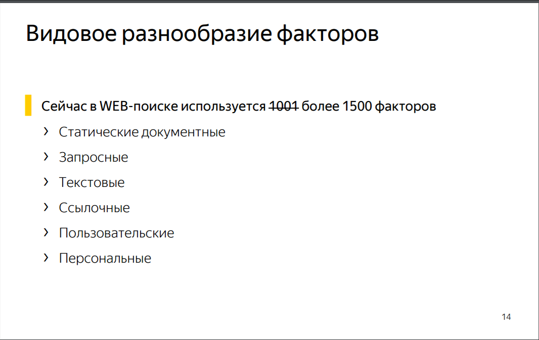 Главное же не в этом. Доклад был не для сеошников, а для разработчиков. И «не работает» означает «не помогает улучшать качество поиска». Далее Александр Сафронов рассказывает, почему именно не помогает — а просто потому, что уже накоплен огромный массив «обкатанных» факторов. Опираться чисто на статистику по текстам нет смысла. Ведь в распоряжении Яндекса ценнейшие данные о поведении миллионов пользователей которые эти тексты оценивают, выбирая (или не выбирая) их в выдаче.