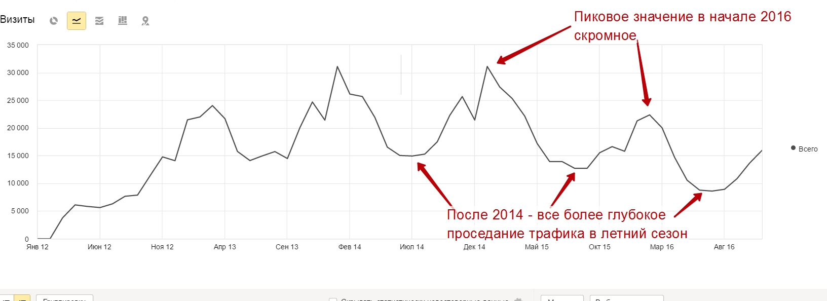 Вот общая динамика поискового трафика по месяцам. Легко видеть как проект после 2014 года теряет трафик: