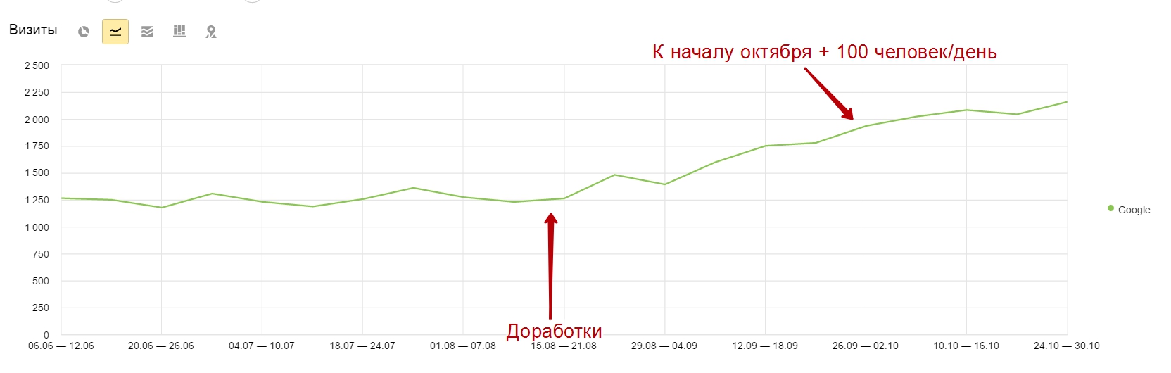 В 2017 году в среднем на пару сотен визитов в неделю больше. После октября никаких работ и расходов не было, так что вложения успели окупиться уже не один раз.