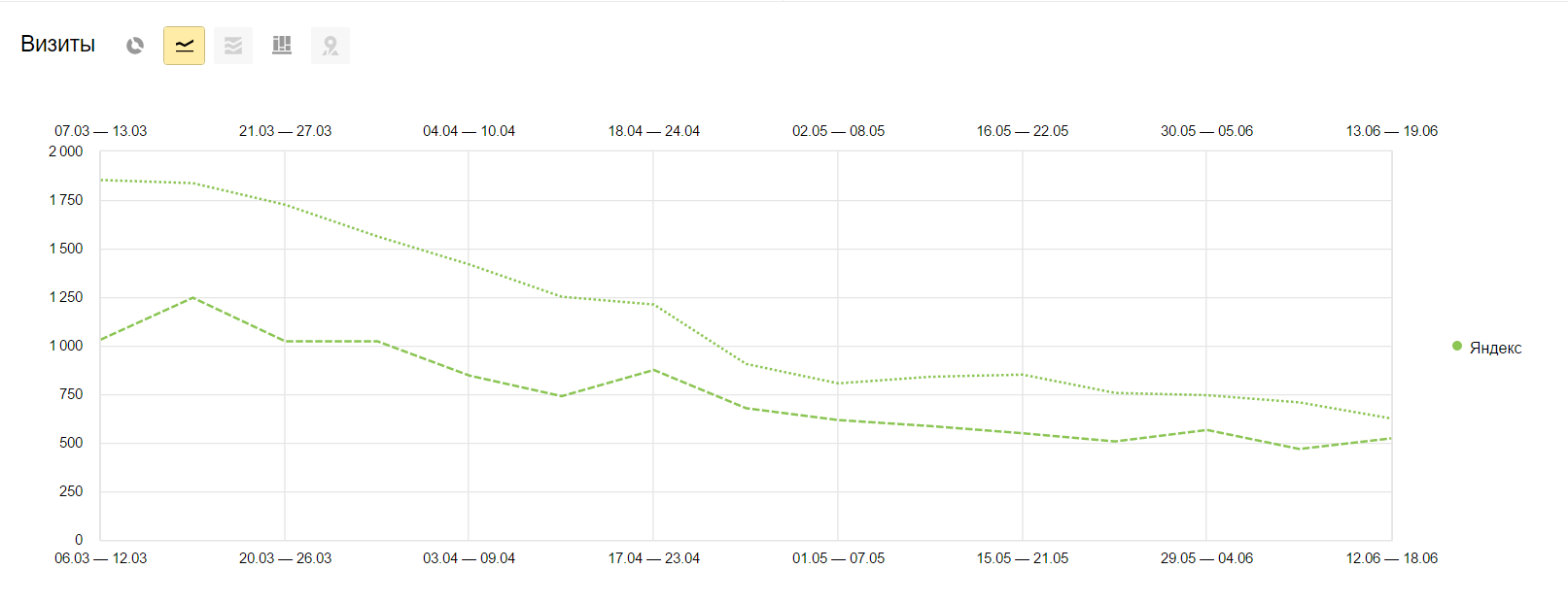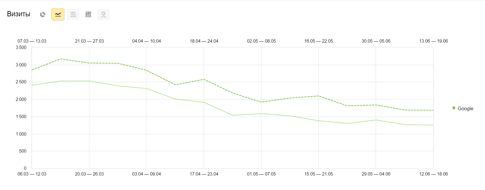 Видим плавное сезонное снижение посещаемости. Влияние сезона в тематике сильное (см. график начале поста). Примечательно, что к концу периода отставание от прошлого года сокращается. В левой части графика разрыв порядка 60-70%, в правой — только 20%. Тут нужно принимать в расчет также, что доля Яндекса с того времени серьезно сократилась (см. в моем докладе на Allintop).