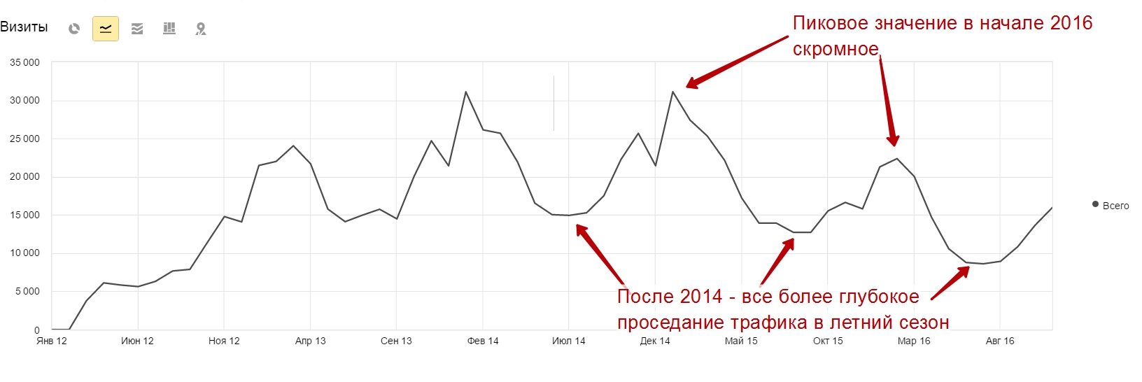 Вот общая динамика поискового трафика по месяцам. Легко видеть как проект после 2014 года теряет трафик: