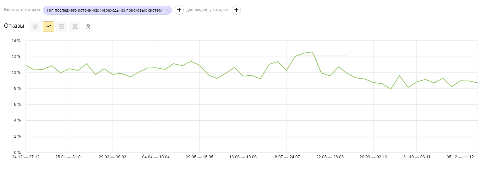 Наконец, контент на сайте не просто ловко заточили под поисковики. Публикации стали более качественными, о чем говорит снижение показателя отказов: