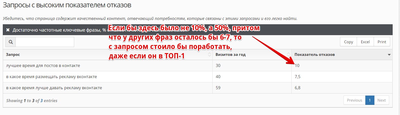 Исключение — если видите, что по каким-то ключам прямо огромный показатель отказов, хотя по запросу предплагается вдумчивое чтение. Лучше поработать на перспективу и обеспечить пользователей адекватным контентом. Пояснение на картинке: /wp-content/uploads/2017/03/2017-03-1518.58.10.png