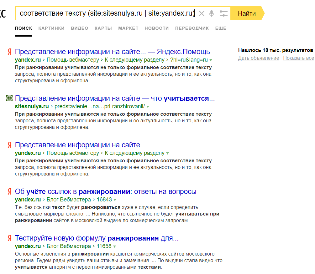 - Полагаться на поиск с site: как методику определения релевантной запросу страницы неправильно (а зачастую даже вредно!).