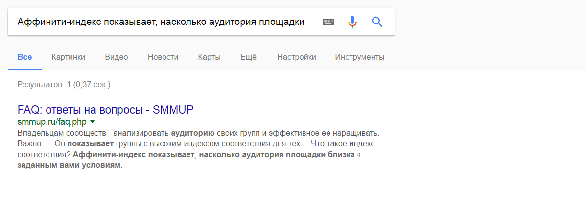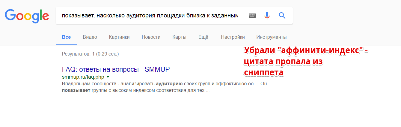 Вот результаты поиска по цитате из «аккордеона» со страницы http://smmup.ru/faq.php (для скриншота применил оператор site:, в нормальной выдаче ситуация аналогична, просто сайт далеко не на первой позиции).