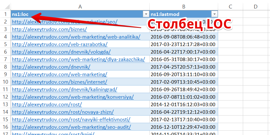 Для удобства работы выгружаем url в виде простого списка. Это можно сделать, открыв xml-файл в Excel: