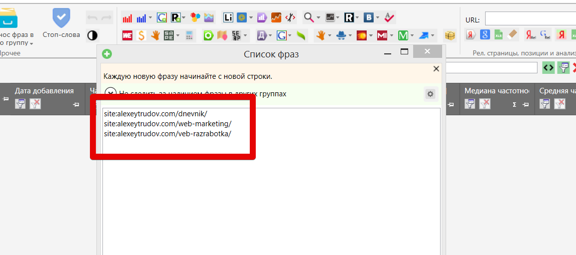Если хотите еще сократить список кандидатов на платную проверку, то можете также определить список страниц, приносивших трафик за последнюю неделю-две (уж они-то почти наверняка в индексе!) и отсеять найденные. О том, как выгружать url точек входа см. в статье об анализе страниц, потерявших трафик.