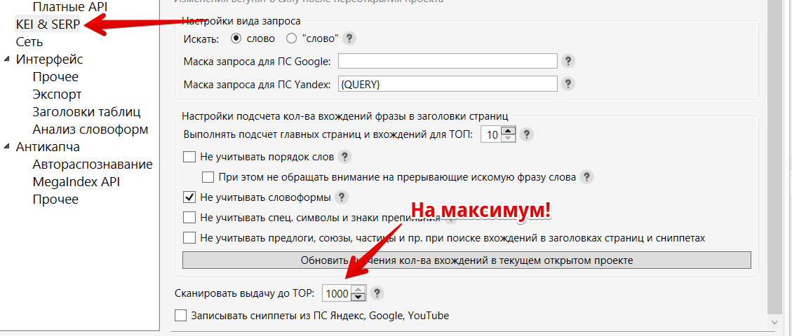 Перед запуском настроим максимальное количество результатов в выдаче: