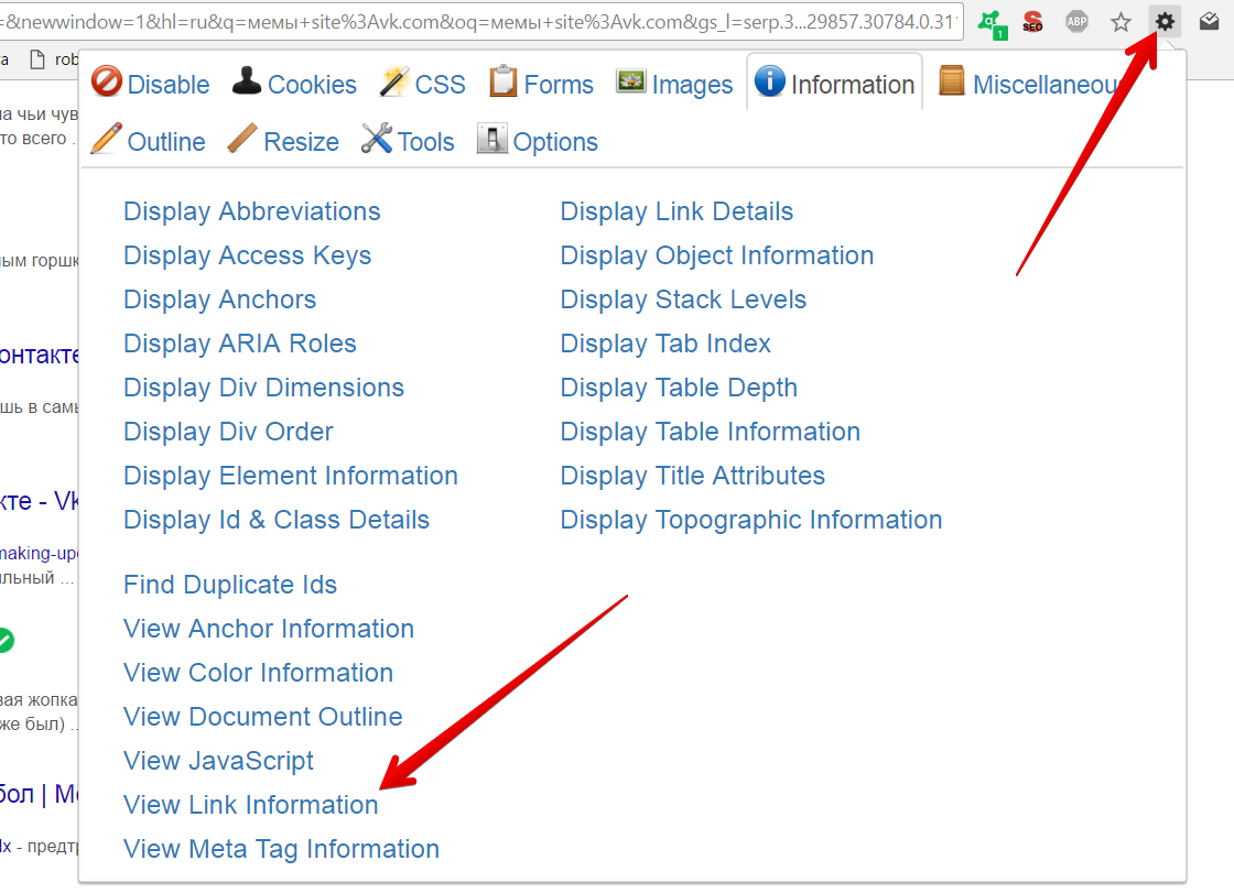 Для формирования перечня ссылок нажимаем на значок Web Developer: