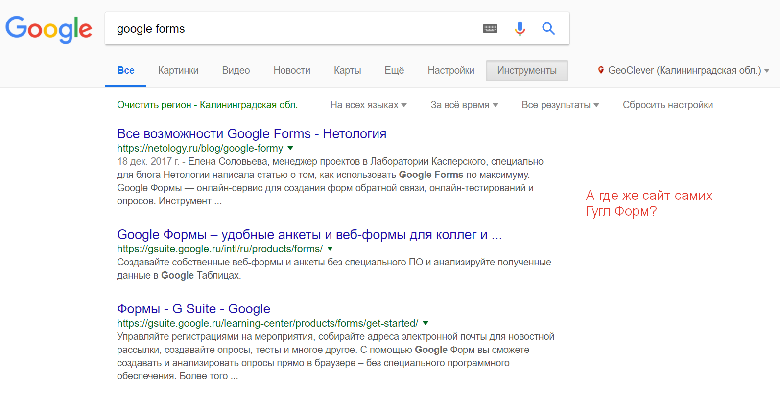 Без указания параметра uule, как и следовало ожидать, на первом месте формы для обычных пользователей (не из G Suite).