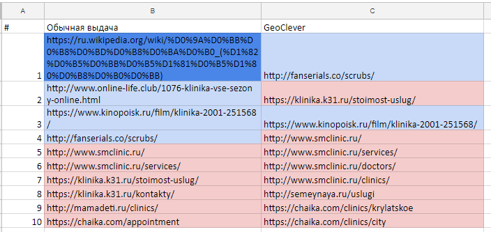Голубым выделены документы, которые соответствуют информационному интенту, красным — коммерческому. Синим я пометил Википедию, как едва ли не главный маркер информационности. Невооруженным глазом видно, что степень коммерциализации запроса во втором случае гораздо выше. Однако эти различия наведены искусственно сужением выборки сайтов до московских.