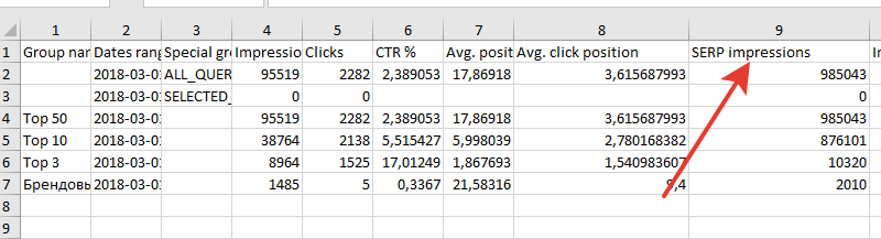 Чем выше отношение Impressions/SERP impressions — тем лучше. Если оно равно единице, это значит, что наш сайт всегда показывается пользователю по данному запросу.