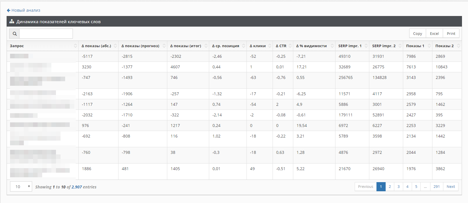 - Δ показы (итог) — самый главный показатель, это оценка, как много показов потерял (или получил) сайт по запросу именно из-за изменения позиций. Влияние изменения популярности запроса отсюда убрано. Получается вычитанием второго столбца из первого.