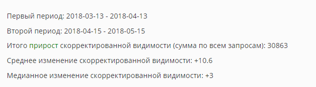 Сервис также показывает суммарное, среднее и медианное изменение видимости (полезно для экспресс-оценки). По моим наблюдениям, прирост/падение скорректированной видимости хорошо коррелирует с изменением объема трафика с Яндекса.