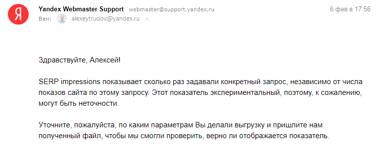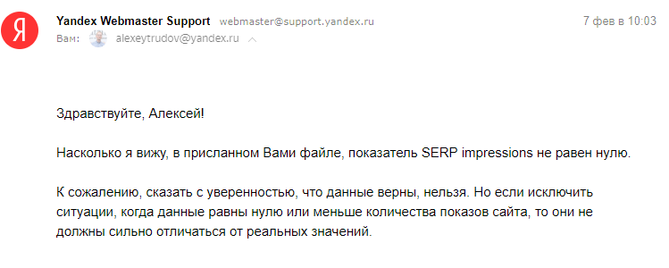 Наконец, есть проблемы с точностью данных в самом Вебмастере. В некоторых случаях SERP impressins оказывается равен нулю, в то время как по запросу были показы и клики. Я написал в ТП Яндекса по этому поводу. Вот некоторые ответы из переписки: