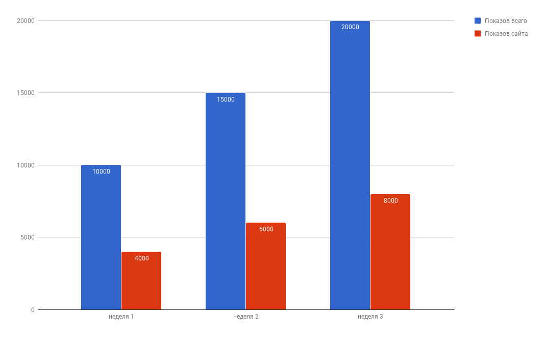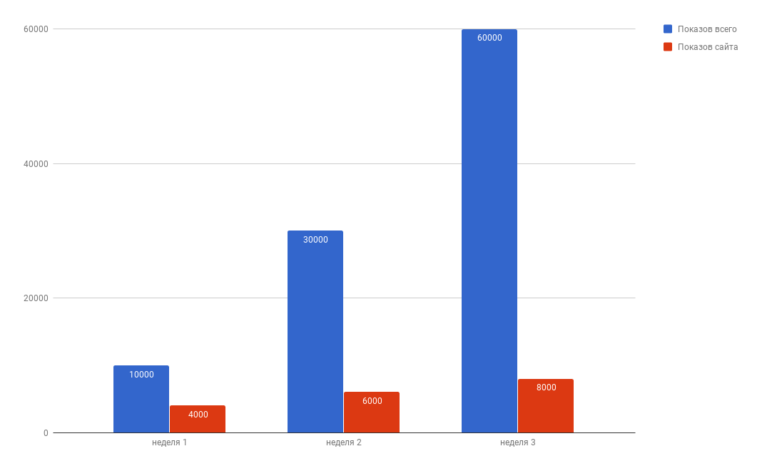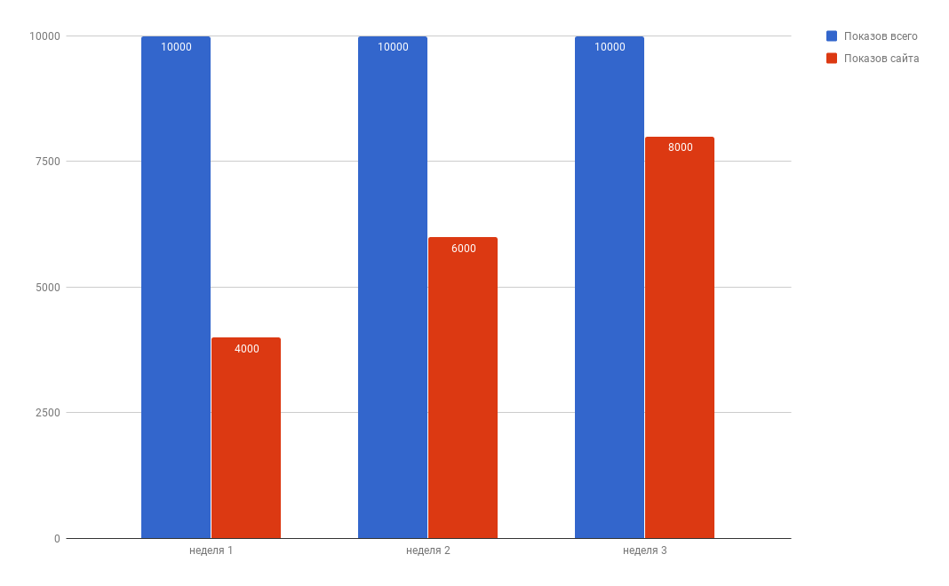 Во всех случаях сайт получает одинаковое количество показов, хотя ситуации принципиально разные. Об этих отличиях как раз очень явно сигнализирует соотношение показы сайта/все показы.