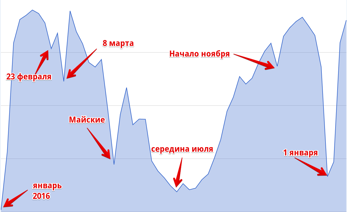 Формировал эту статистку в основном из праздного интереса, однако для владельцев сайтов общей тематики, которые слабо привязаны к конкретному сезону, знать подобные закономерности полезно. Она помогает понять, например, можно ли списывать провал трафика летом на тренд всего Рунета или же падение слишком велико и возникли реальные проблемы с сайтом (например, из-за неправильного переезда на https).