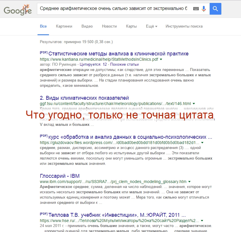 Выделена цитата, которую я забил в Google. Она длинная и уникальная. По идее сайт должен показываться в ТОП-1. Но это не так:
