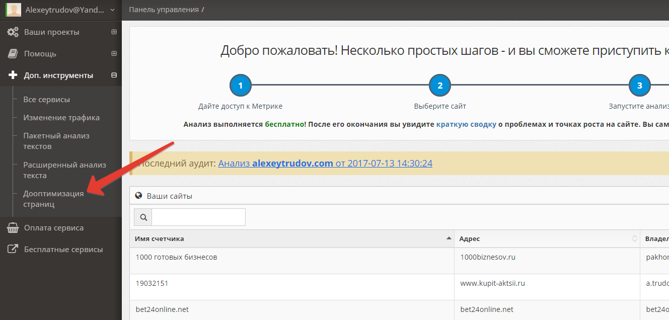 В панели сервиса переходите в «Дополнительные инструменты» — «Дооптимизация важных страниц». Анализ одного url стоит 5 лимитов, 1 лимит — 50 копеек.