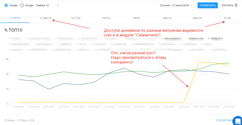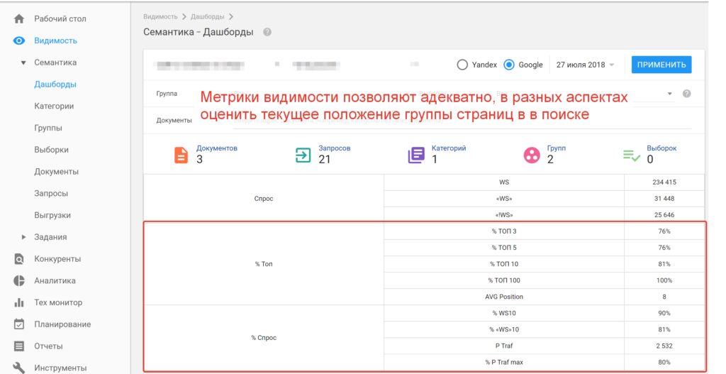 К сожалению, пока не реализовано сравнение с конкурентами по категориям прямо в интерфейсе (нужно выгружать в excel отдельно). Некоторые ключи заводятся в систему в экспериментальных целях и не так важны в плане оценки видимости, но могут ее искажать. Конечно, можно завести отдельный проект под эти дела, но это дополнительные телодвижения.