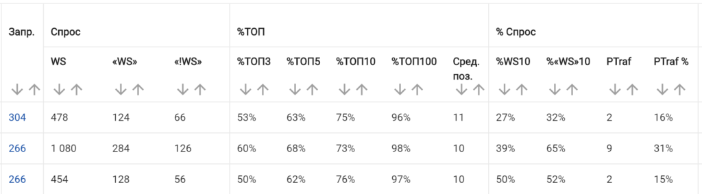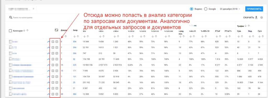 Разумеется, в системе есть полная раскладка и по всем конкретным запросам. Попадаем туда со страницы общей сводки по категориям: