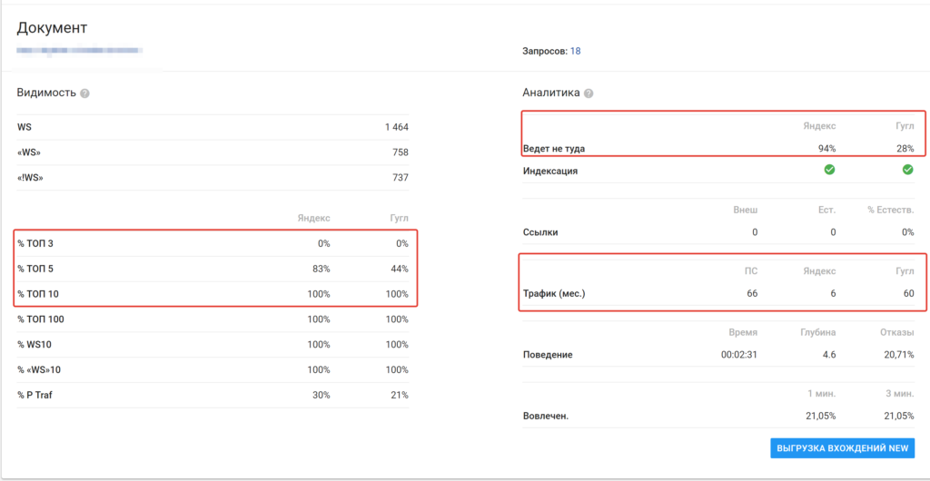 - Ныряем в «За ТОП-100», разбираемся, нет ли проблем по самой базовой оптимизации и подходят ли вообще продвигаемые документы под запросы.