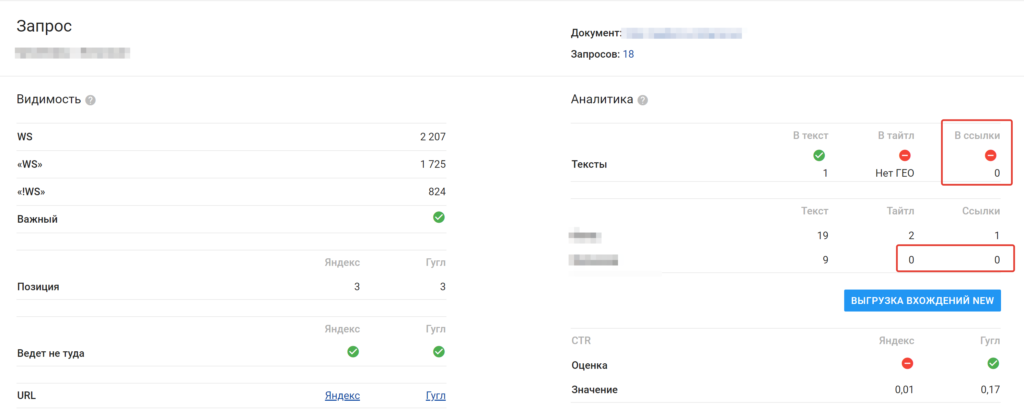 Один взгляд на отчет — и уже есть пачка простых шагов по улучшению позиций: добавить вхождений старым добрым друзьям сеошника: title и анкоры ссылок.