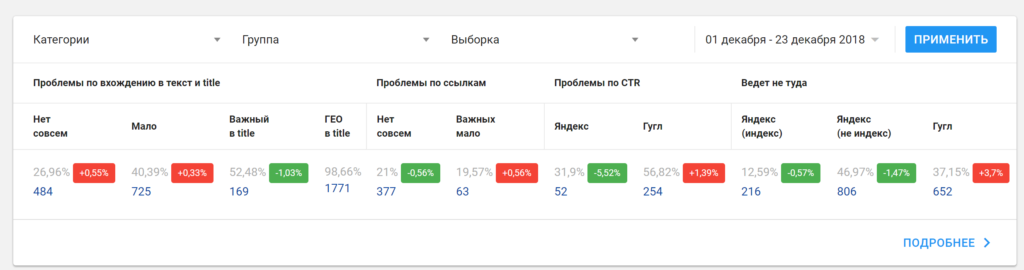 Обратите внимание: в этом дашборде, как и в подавляющем большинстве отчетов SeoWork можно фильтровать данные по группам, категориям и выборкам (подробнее о них ниже, важен сам принцип: статистику можно удобно порезать на сегменты и анализировать любой из них в динамике).