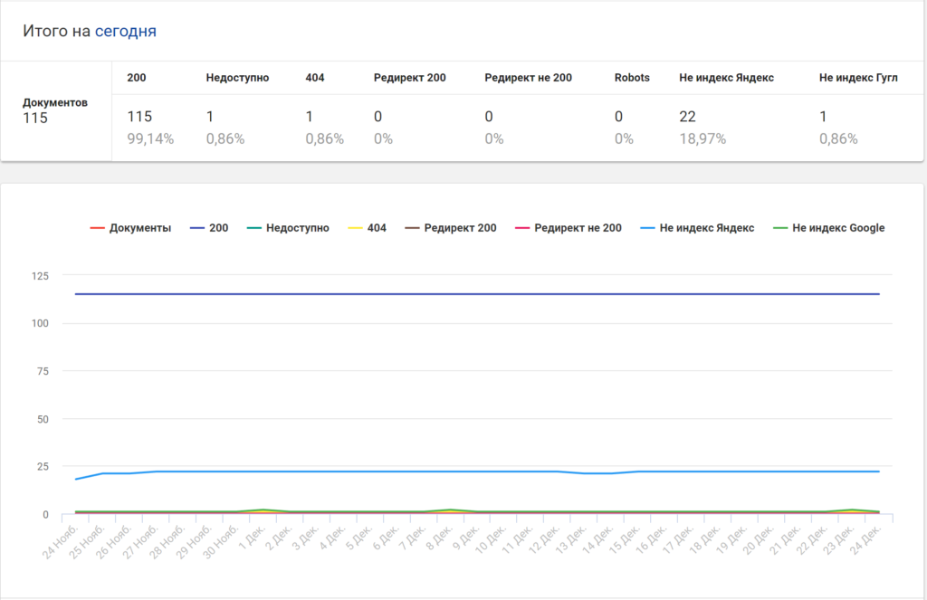 Дает раскладку по ключевым техническим показателям и динамике количества страниц с теми или иными отклонениями (см. на скриншоте):