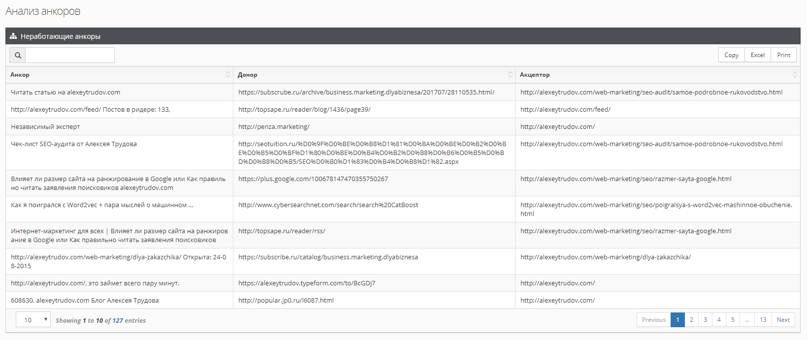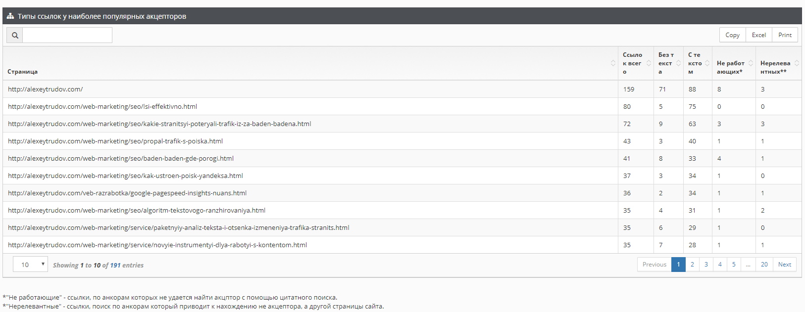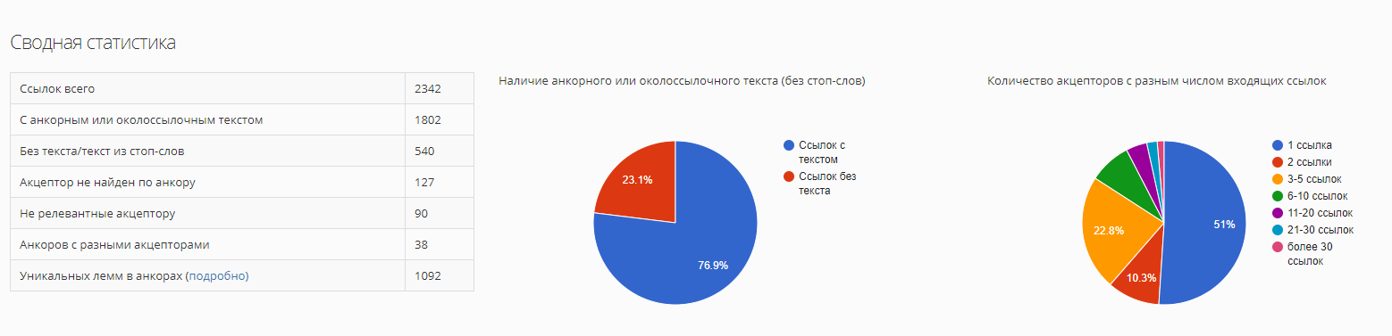 Помогает найти проблемные страницы (много «не работающих» ссылок, много нерелевантных анкоров, много ссылок без анкорного и околоссылочного текста…).