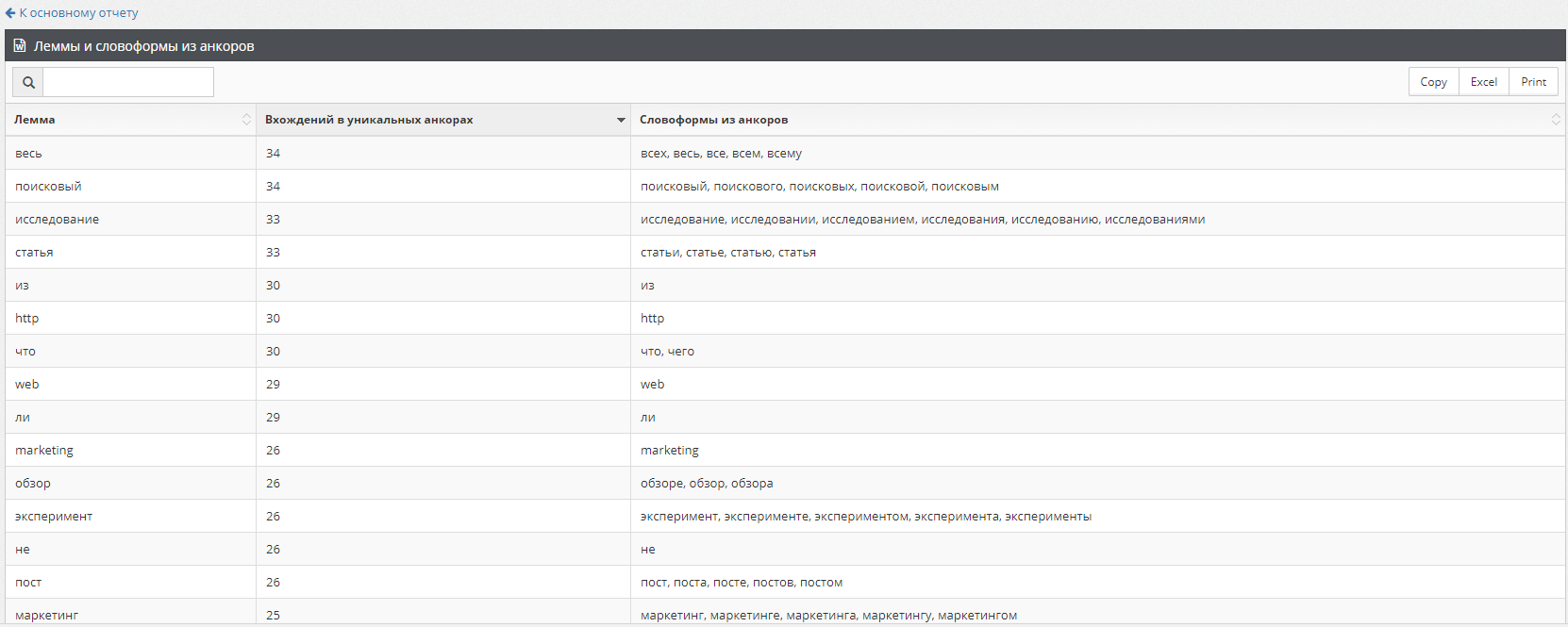 - Нашли популярные леммы с малым количеством словоформ — проверяем, нет ли перебора с однотипными анкорами.