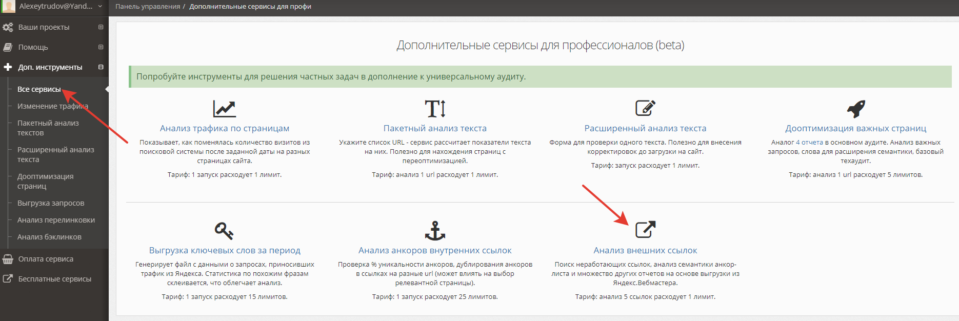 Стоимость — анализ 5 ссылок расходует один лимит. Анализ 1000 внешних ссылок обойдется в 100 рублей (с промокодами дешевле).