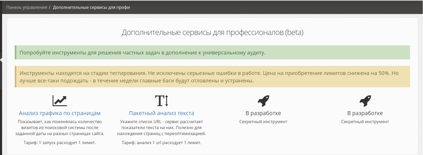 На использование инструментов тратятся лимиты, которые нужно покупать отдельно от оплаты аудитов. В конечной версии цена 1 лимита будет от 50 копеек до рубля (в зависимости от объема покупки). На данный момент цена снижена до 25 копеек. Не потому что стремлюсь побольше продать. Наоборот, сейчас готовлюсь выступать на SEMPRO, так что наплыв пользователей будет меня отвлекать. Просто совесть не дает брать полную цену за сырые сервисы.