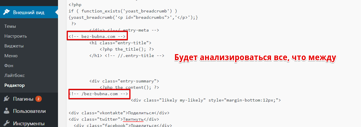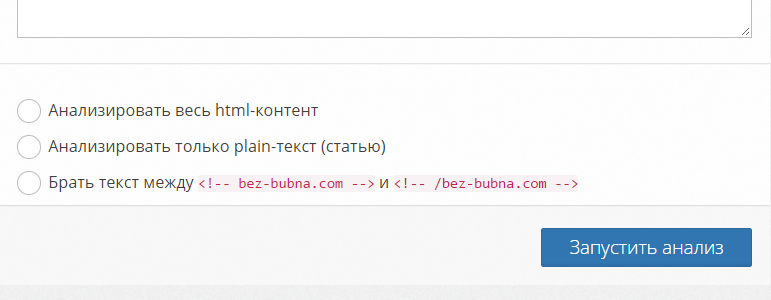 Важно понимать, что очистка контента от «примесей» весьма непростая задача. Plain-текст удается вычленить не всегда (зачастую «портянки» и нет на странице). В этом случае будет обрабатываться весь текст. Для точного нацеливания сервиса стоит разместить в коде комментарии-указатели. Например, у меня на блоге: