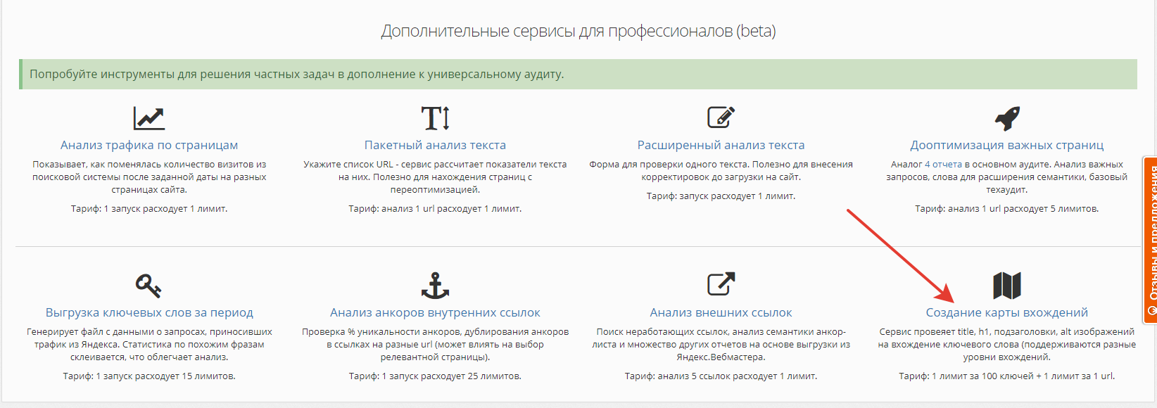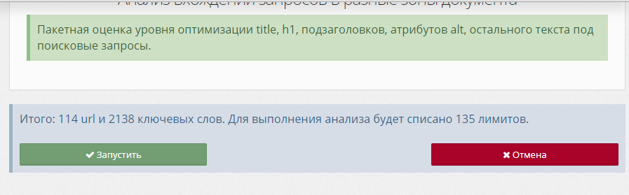 На запуск расходуются лимиты: 1 лимит за url + 1 лимит за 100 запросов. То есть, анализ 1 страницы с 100 ключами израсходует 2 лимита (итого рубль без промокодов). Анализ выгрузки из keys.so для этого блога обошелся в 135 лимитов: