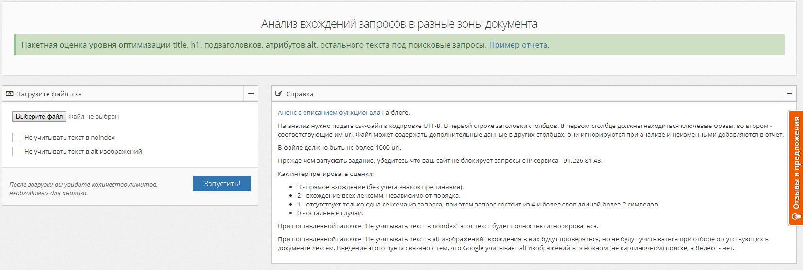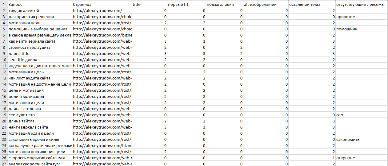 Идея очень простая. На вход подается список ключей и адресов страниц. Система скачивает контент и ищет вхождения запроса в title, h1, подзаголовки, alt изображений, прочий контент. В итоге получается таблица, которая позволяет взглянуть текстовую оптимизацию с высоты птичьего полета. Она служит отличной отправной точкой в продвижении сайта.