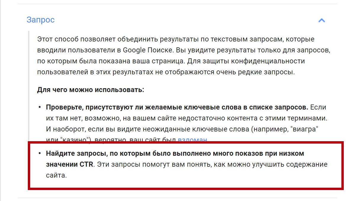 Здесь также присутствует отчет по запросам с низкой позицией, но достаточно большим количеством показов: