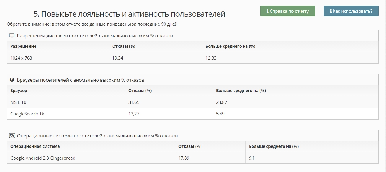 Теперь в этом разделе аудита выводятся сведения о браузерах, расширениях дисплеев и операционных системах, пользователи которых показывают на вашем сайте аномально высокий показатель отказов.