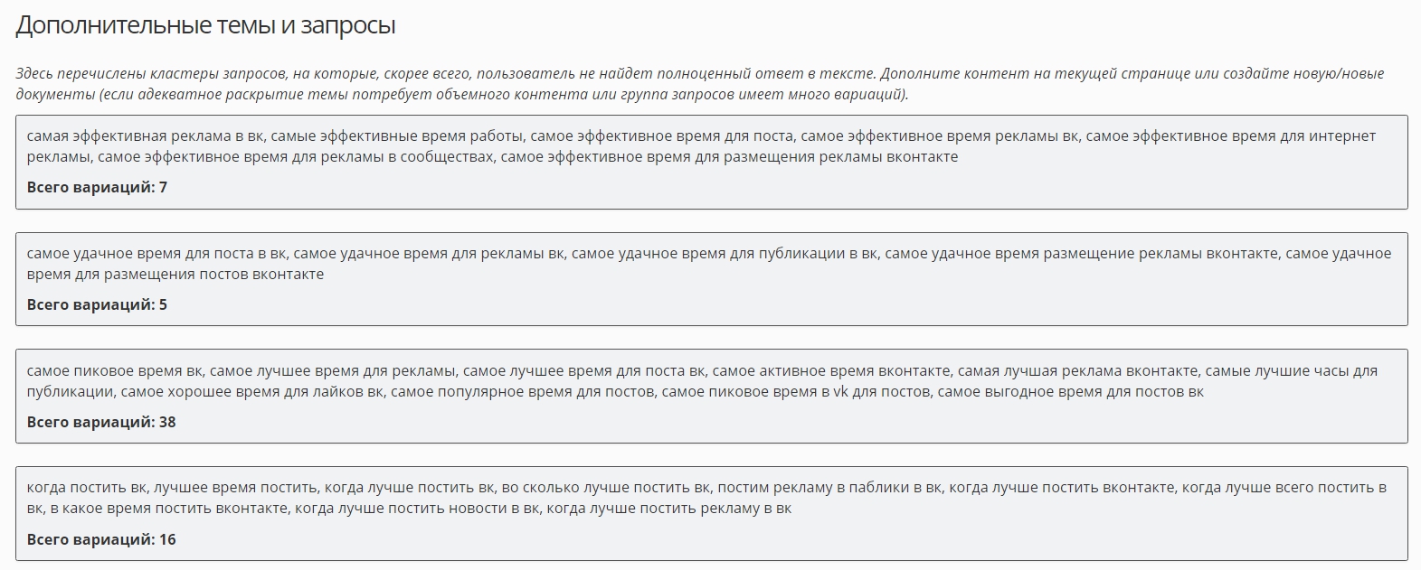 Заключительный (пока) отчет — до 10 тем, которые, скорее всего, плохо описаны в тексте. Темы представлены в виде кластеров поисковых запросов: