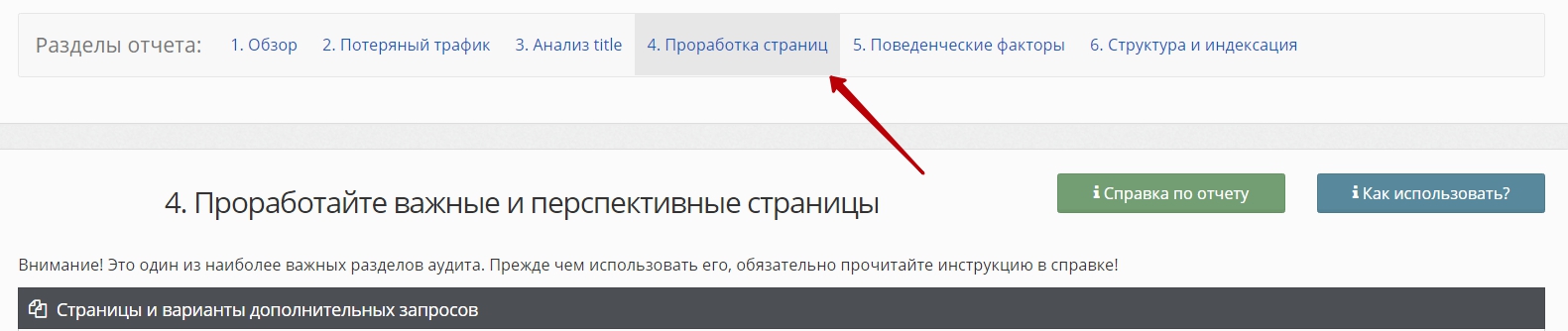 Чтобы получить доступ к отчету, откройте в аудите вкладку «Проработка страниц». Вы можете работать с ним в течение 30 дней после выполнения анализа: