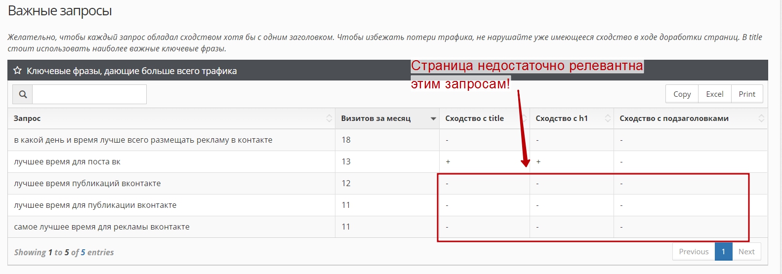 Это фрагмент анализа страницы моего блога Лучшее время для рекламы в пабликах. Легко видеть, что из 5 важных запросов лишь один обладает сходством с title и заголовками, страница недостаточно оптимизирована под них. Да, она привлекает по ним трафик, но его можно увеличить, сделав чуть более точные вхождения.